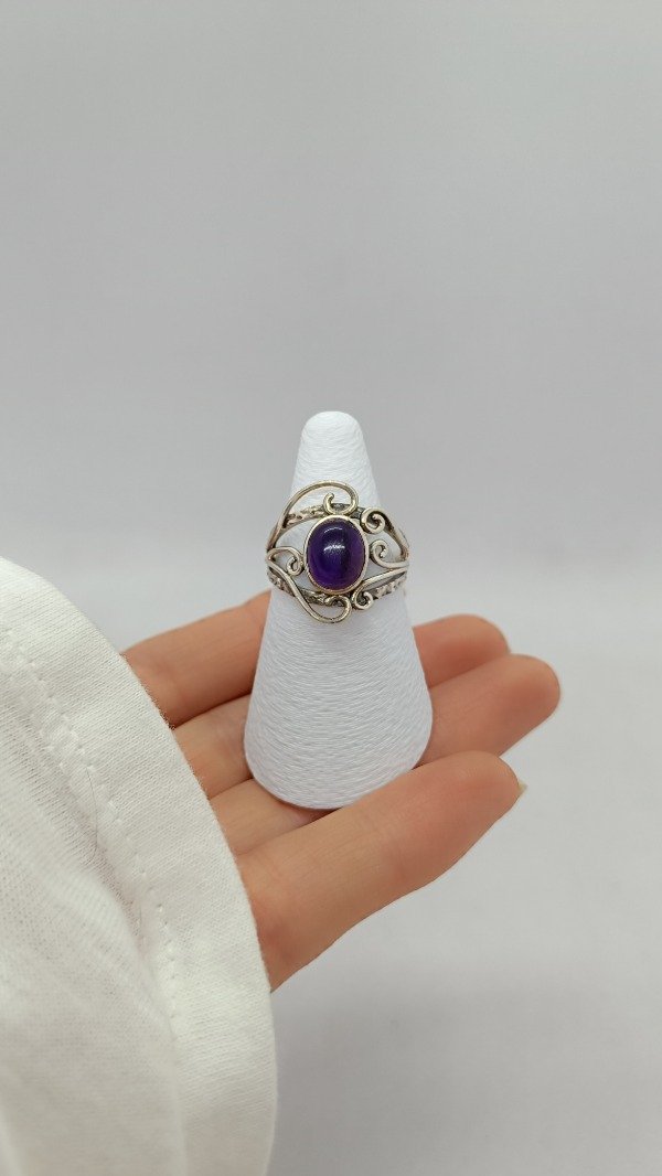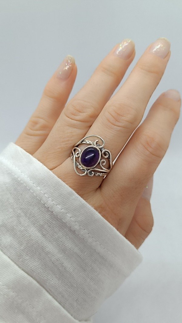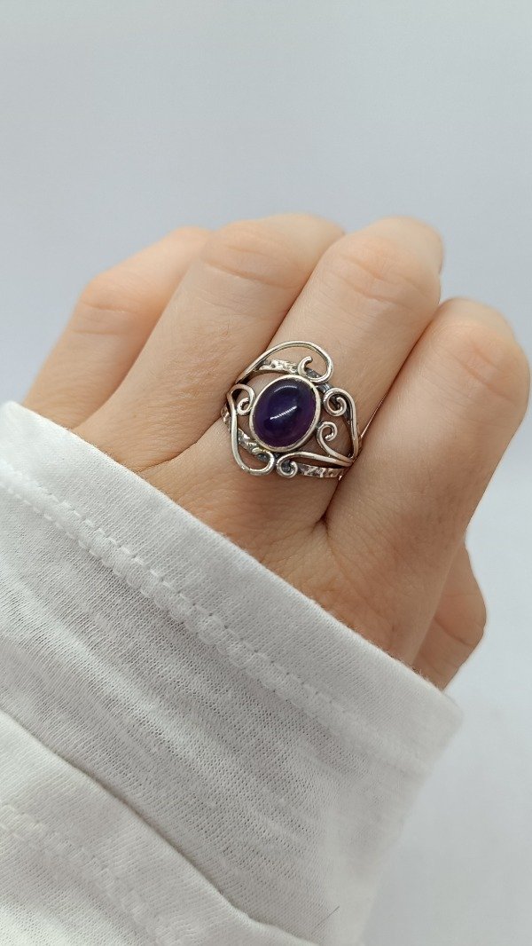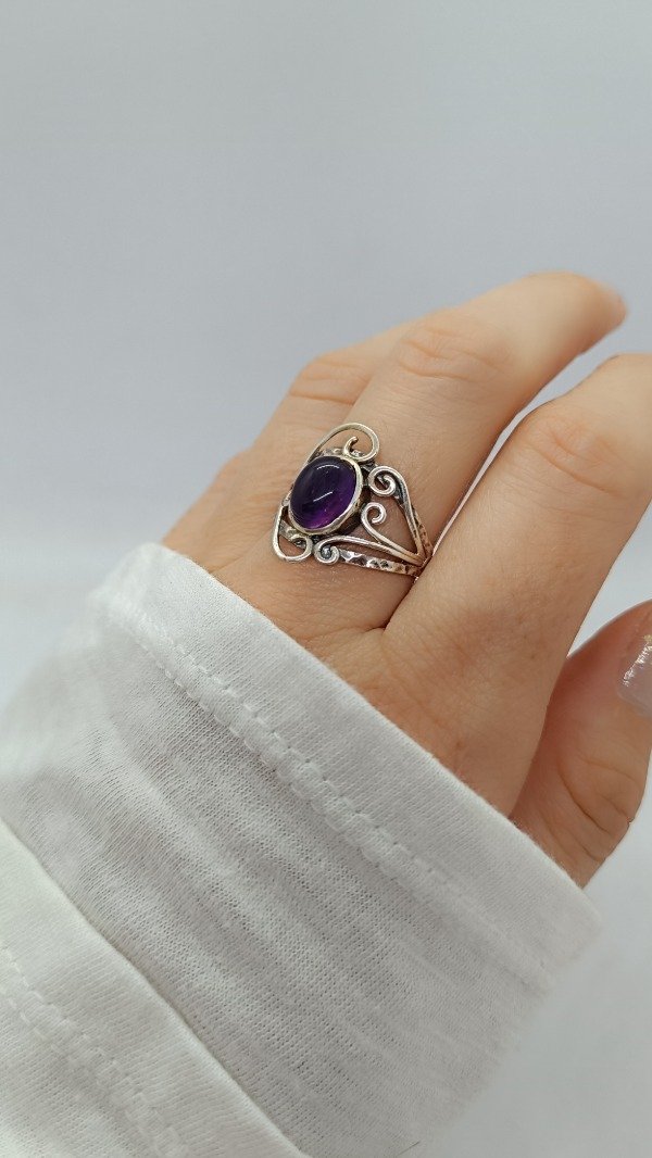 Anillo de plara labrado con engarce de Amatista.