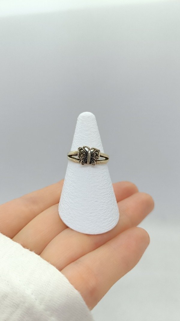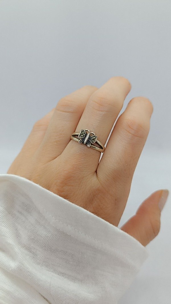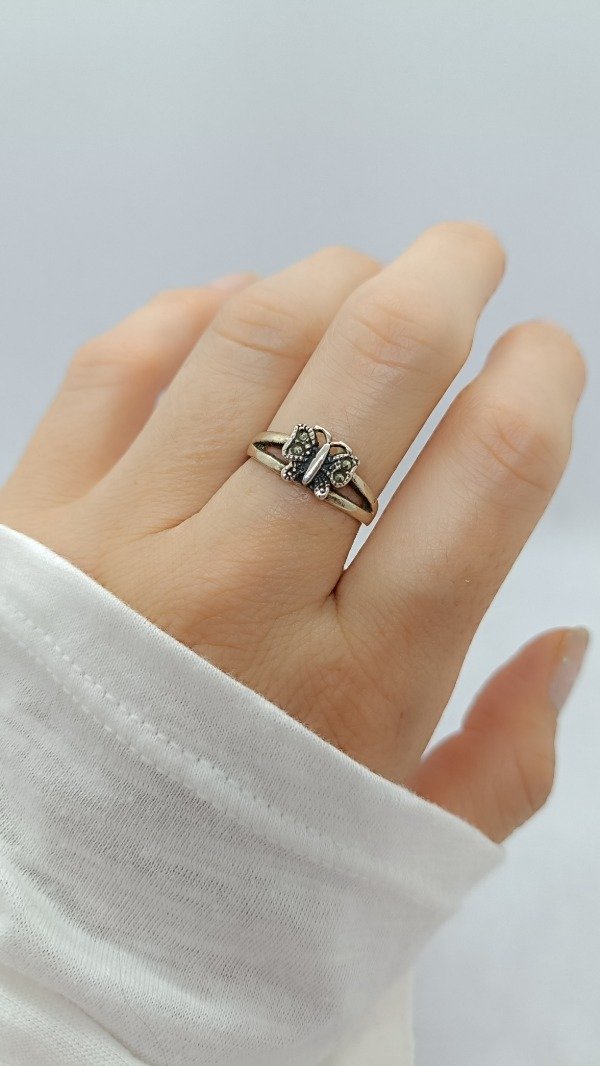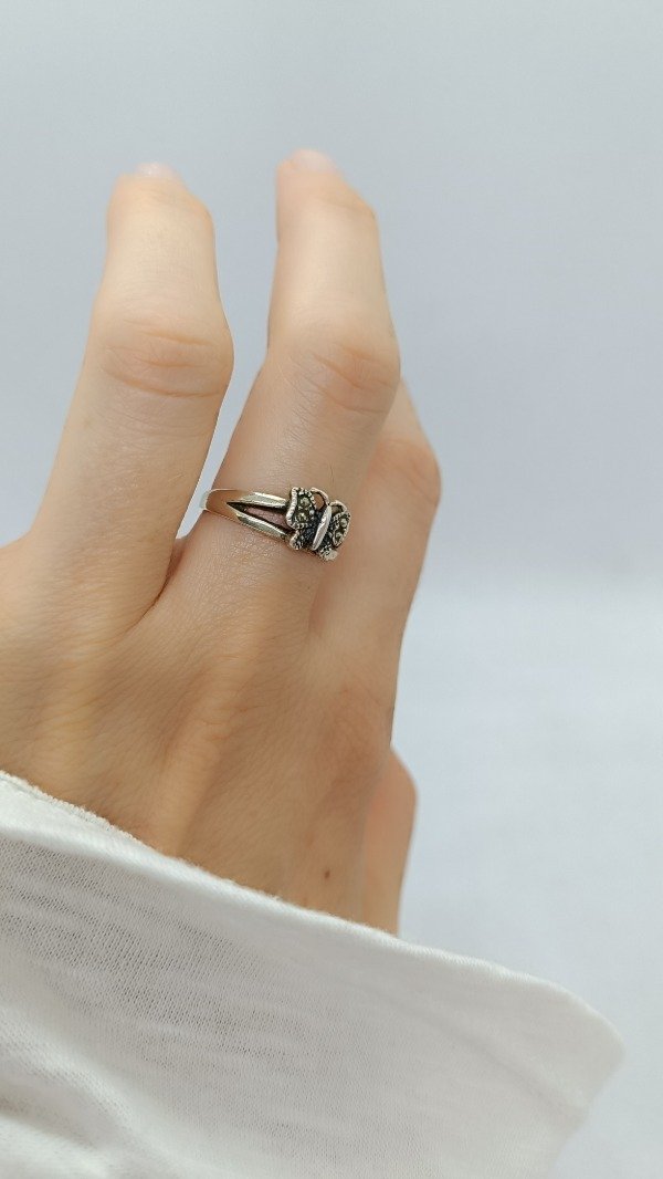 Anillo de plata maciza con Mariposa labrada y engarces de Marquesitas negras.