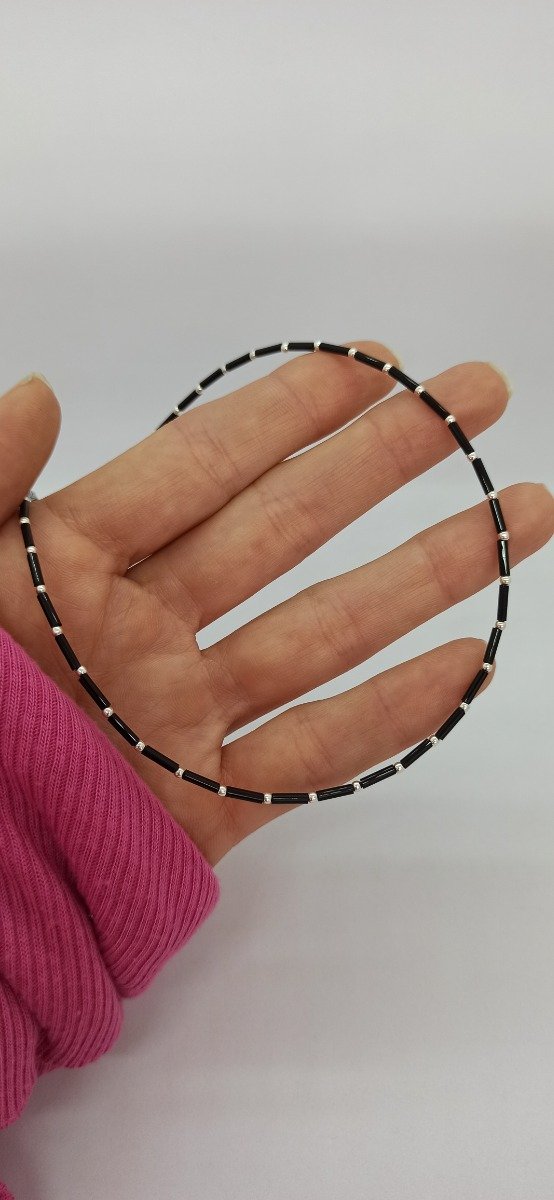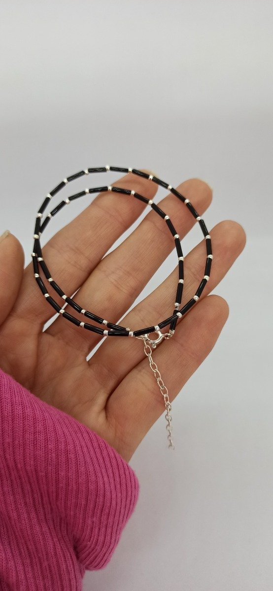 Gargantilla fabricada en plata y canutillos negros.