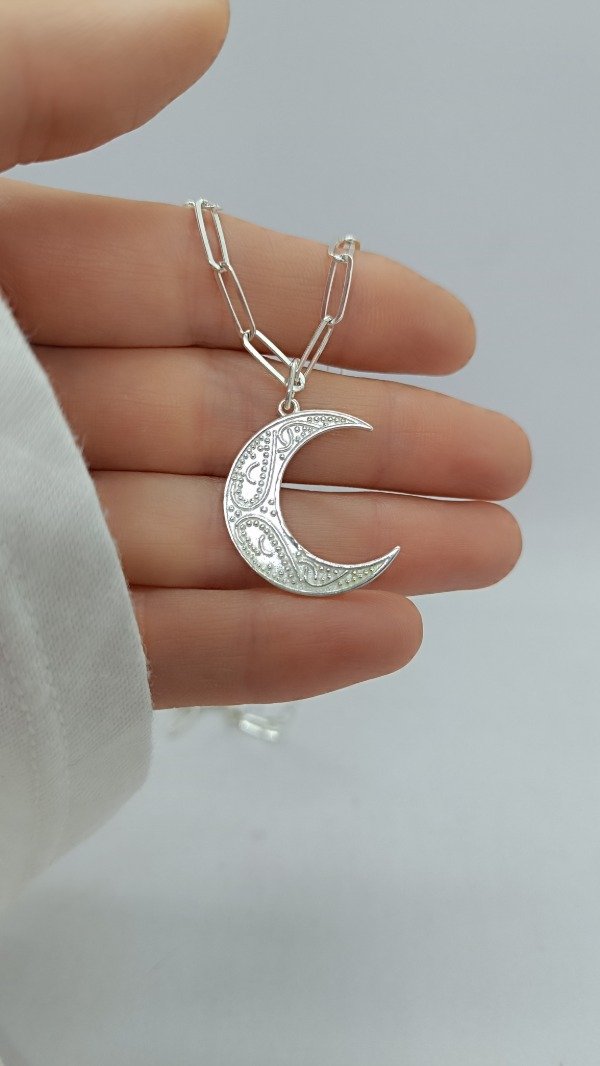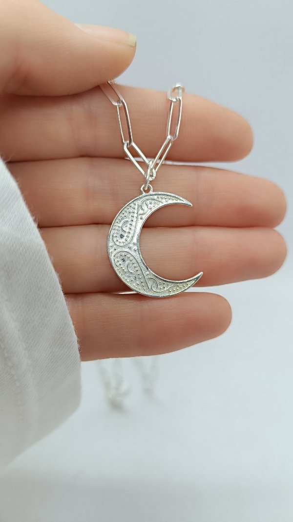 Un dije de luna simboliza feminidad, intuición, el ciclo de la vida y las emociones. También puede representar el cambio, la magia interior, el misterio y la protección. Dependiendo de la forma, puede significar la armonía de opuestos (una luna llena) o el inicio de proyectos y cambios (una media luna creciente).