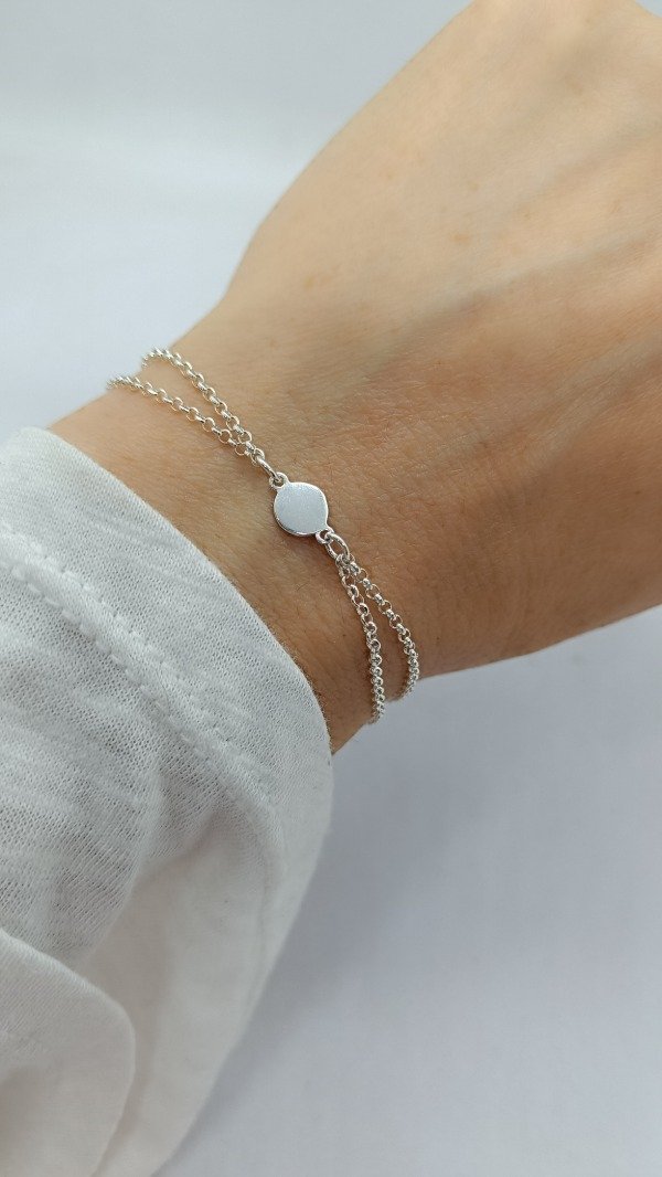 Pulsera doble de plata, con círculo de plata lisa, la cual puede grabarse con detalle personalizado.