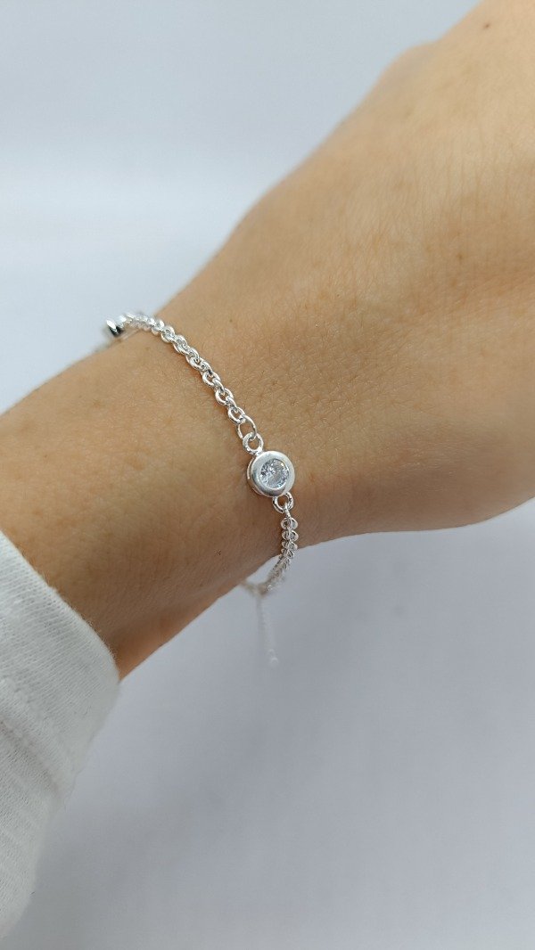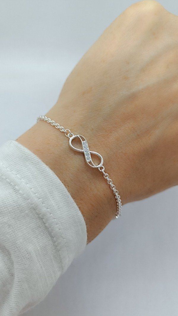 Pulsera de plata con dije de infinito con engarces de microcubics, y bolitas con puntos de luz.